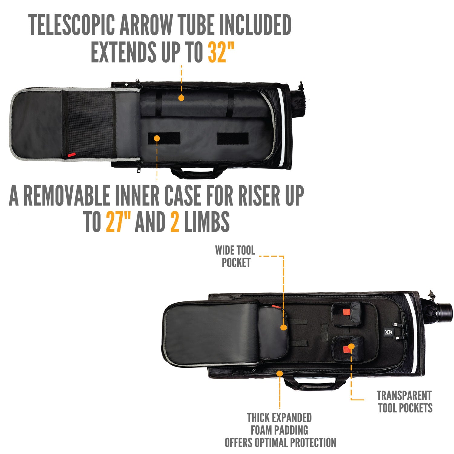 HIGH CAPACITY - Your new bow bag can carry up to 2 bows, your arrows, quiver, sights, plunger, strings, bow stringer and other accessories and equipment. It has an extendable telescopic hard shell arrow holder that can hold up to 2 dozen arrows. 3 inner pockets offer additional storage capacity.