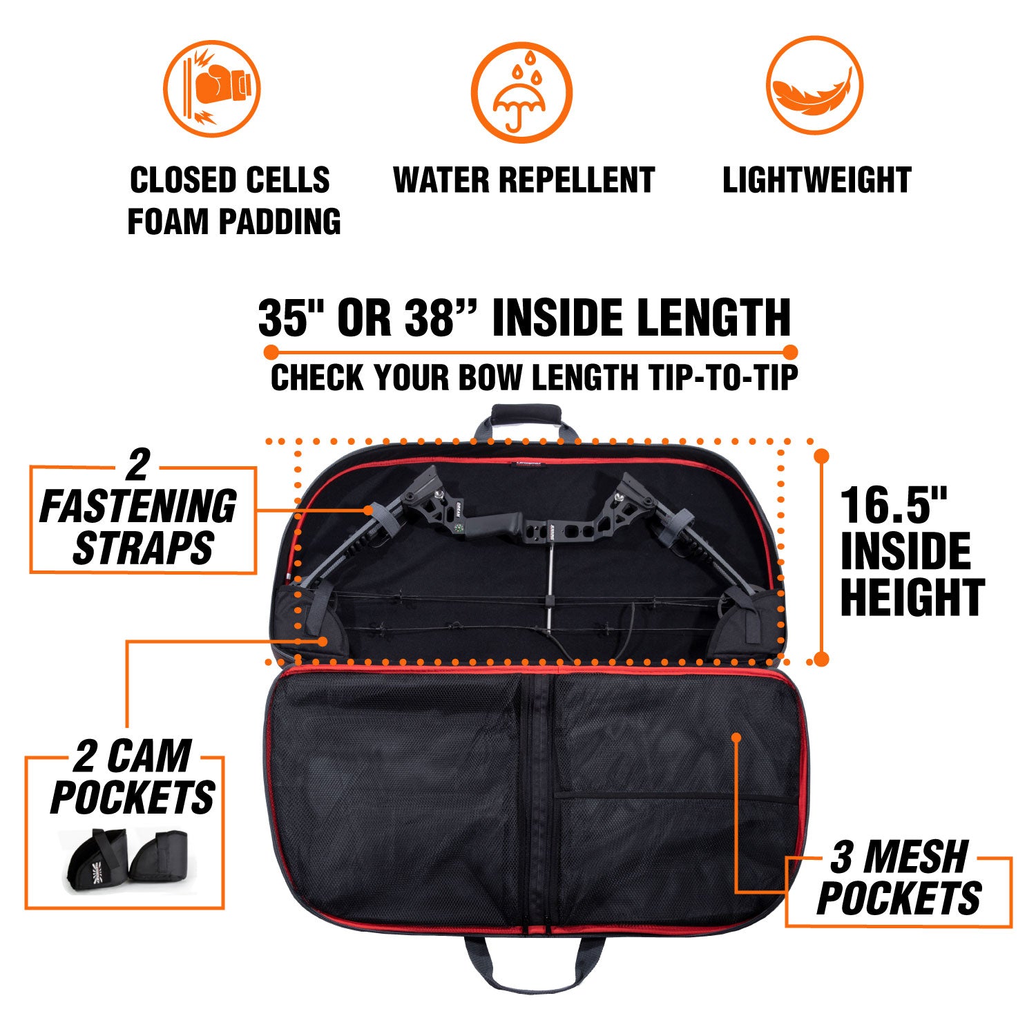 • STORAGE; Each Crusader soft bow case has a 35 or 38 inch interior measuring 16.5 inches high; With 3 interior mesh pockets and 4 exterior pockets for food, drinks and gear, the largest external pocket of our compound bow and arrow case can fit a telescopic arrow tube case or MTM Ultra Compact arrow case